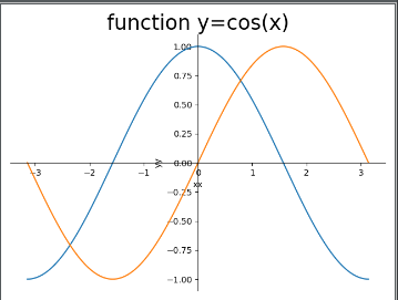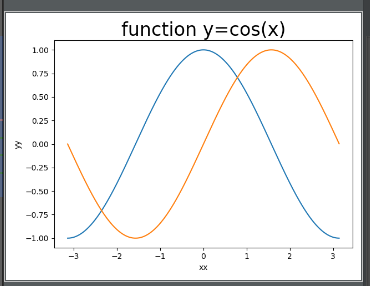 x = np.arange(-1 * np.pi, 1 * np.pi,0.01)y = np.cos(x)y1=np.sin(x)plit.plot(x, y,x,y1)plit.title("function y=cos(x)", fontsize=24)plit.xlabel("xx")plit.ylabel("yy")plit.show()
